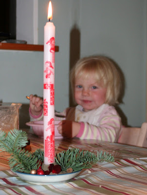 Det var mormor der hentede igår, og de skulle til svømning. Hele vejen sad Elisabeth troeligt og holdt sin dekoration på en paptallerken, som måtte tilrettes lidt da de nåede hjem på Tværvej (lyset var vist blevet temmelig skævt, og noget af pynten var faldet af). På Tværvej hos mine forældre blev jeg præsenteret for kreationen, som jeg selvfølgelig roste og spurgte om ikke mormor og morfar skulle have den… men NIX, det kunne jeg godt glemme. Elisabeth hævdede højt at det var hendes! Og hjem kom den!