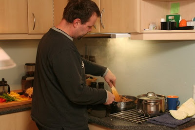 Brian havde lovet at lave aftensmad(!!!???), så her er han igang med én af hof-retterne: Chop Suey (eller hvordan det nu staves). Det smagte godt!