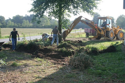 De gamle træstubbe (halvrådne) blev også jævnet og er nu et godt stykke under niveau.Her køres jorden væk, så der er plads til knust beton og vandet ikke løber ind mod bygningen i regnvejr. Jorden blev kørt ud på marken, hvor Kenneth jævnede den lidt med en harve inden han pløjede der ud af.