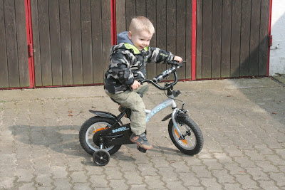 Senere søndag aften var vi inviteret på mad hos mor og far på Tværvej. Og her stod en færdigsamlet cykel til Sebastian. Han blev SÅ glad! Egentlig er det hans fødselsdagsgave, men da han først har fødselsdag midt om sommeren besluttede vi at han gerne måtte få den nu… lidt på forskud, for det er NU han vil bruge den og kan få glæde af den. Man må sige at han øver sig flittigt. Han har ikke helt forstået princippet: At bremse! Men det kommer nok… Jeg kan selv huske mine skrabede knæ fra da jeg lærte at cykle hjemme på gårdspladsen, -og det kommer nok også her.