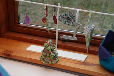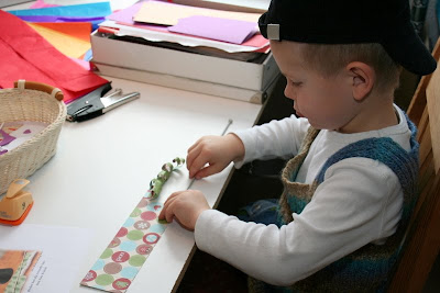 I går gik jeg igang med at afprøve diverse (tyvstjålede) ideer til klippe-klistre-dag i Sebastians børnehave næste fredag. Bl.a. skulle jeg have afprøvet om børn i 3-5 års alderen kunne rulle strimler op om en rundpind, så de søde juletræer kunne laves.