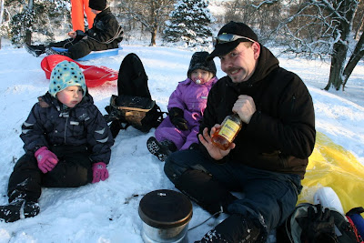 Brian tog trangia-sættet og kakaoen (… og…) med, så vi kunne varme os. Vejret perfekt og der var masser af sne og kælkeplads, samt i ny og næ enkelte andre kælke-entusiaster.